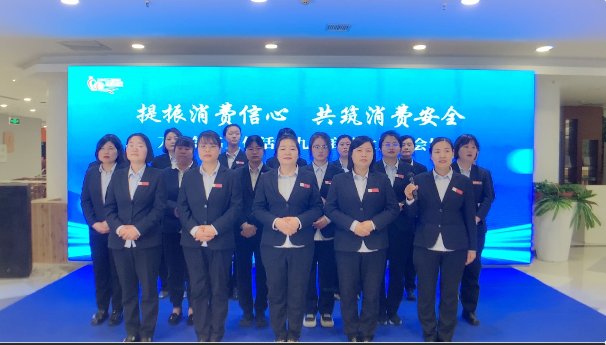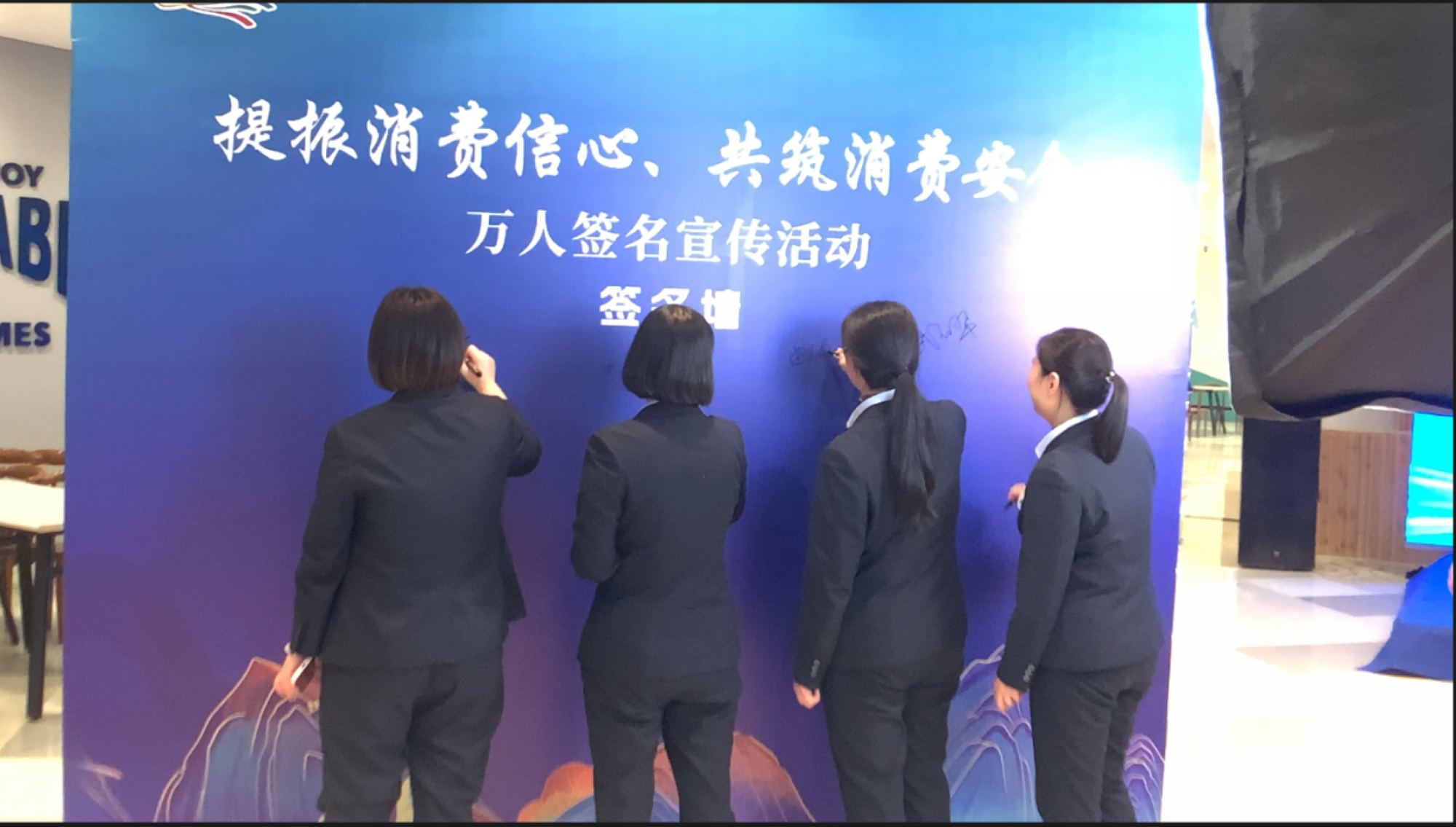活動(dòng)中,九州商業(yè)大廈解放路店組織員工代表在六樓商場(chǎng)觀(guān)看了主會(huì )場(chǎng)的宣傳活動(dòng)情況,同時(shí)連線(xiàn)主會(huì )場(chǎng)進(jìn)行集體承諾發(fā)言,活動(dòng)結束后大家移步到簽名墻進(jìn)行簽名。