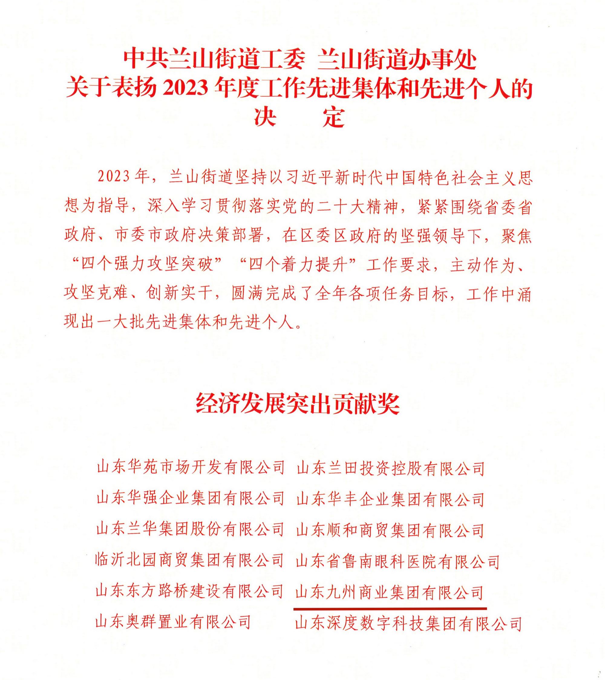 1月20日上午,蘭山街道召開(kāi)2023年度工作總結表彰會(huì )議。會(huì )上,宣讀了《中共蘭山街道工委 蘭山街道辦事處關(guān)于表?yè)P2023年度工作先進(jìn)集體和先進(jìn)個(gè)人的決定》,集團榮獲蘭山街道“經(jīng)濟發(fā)展突出貢獻獎”。