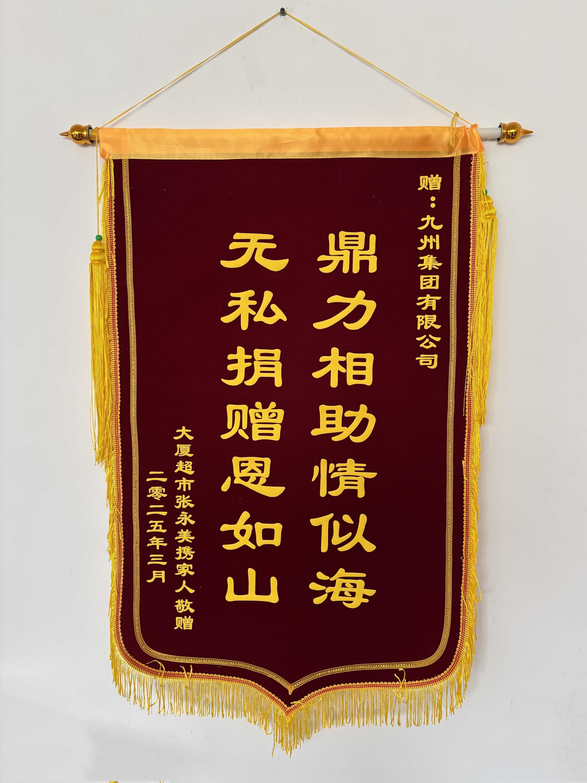 3月6日上午,一面寫(xiě)有“鼎力相助情似海,無(wú)私捐贈恩如山”的錦旗及一封感謝信送到了九州集團,為這個(gè)忙碌的工作日增添了一抹溫馨色彩。