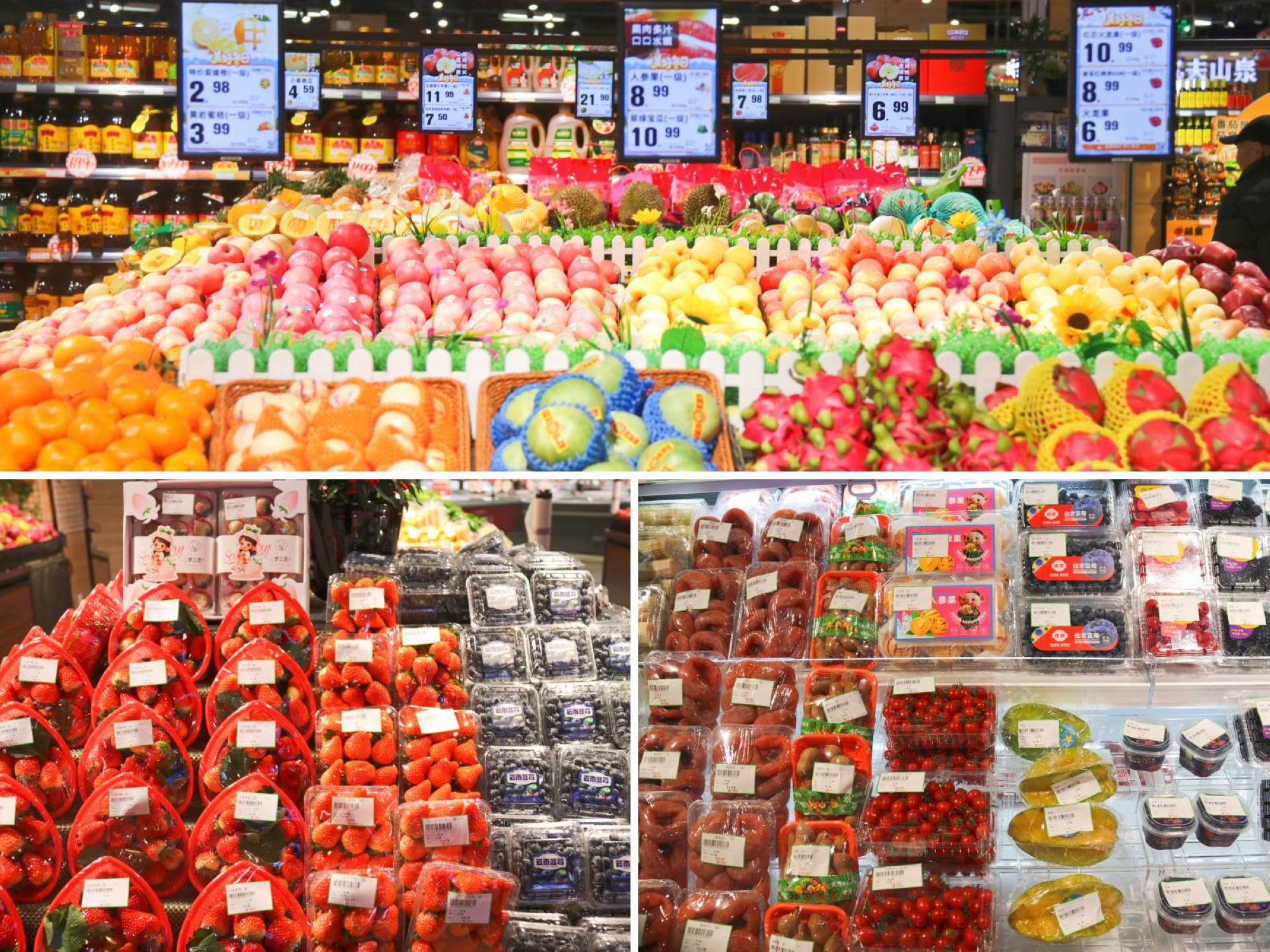水果區(qū)重新規(guī)劃陳列布局,種類更豐富。全面啟用電子價簽,實現(xiàn)價格實時更新。
