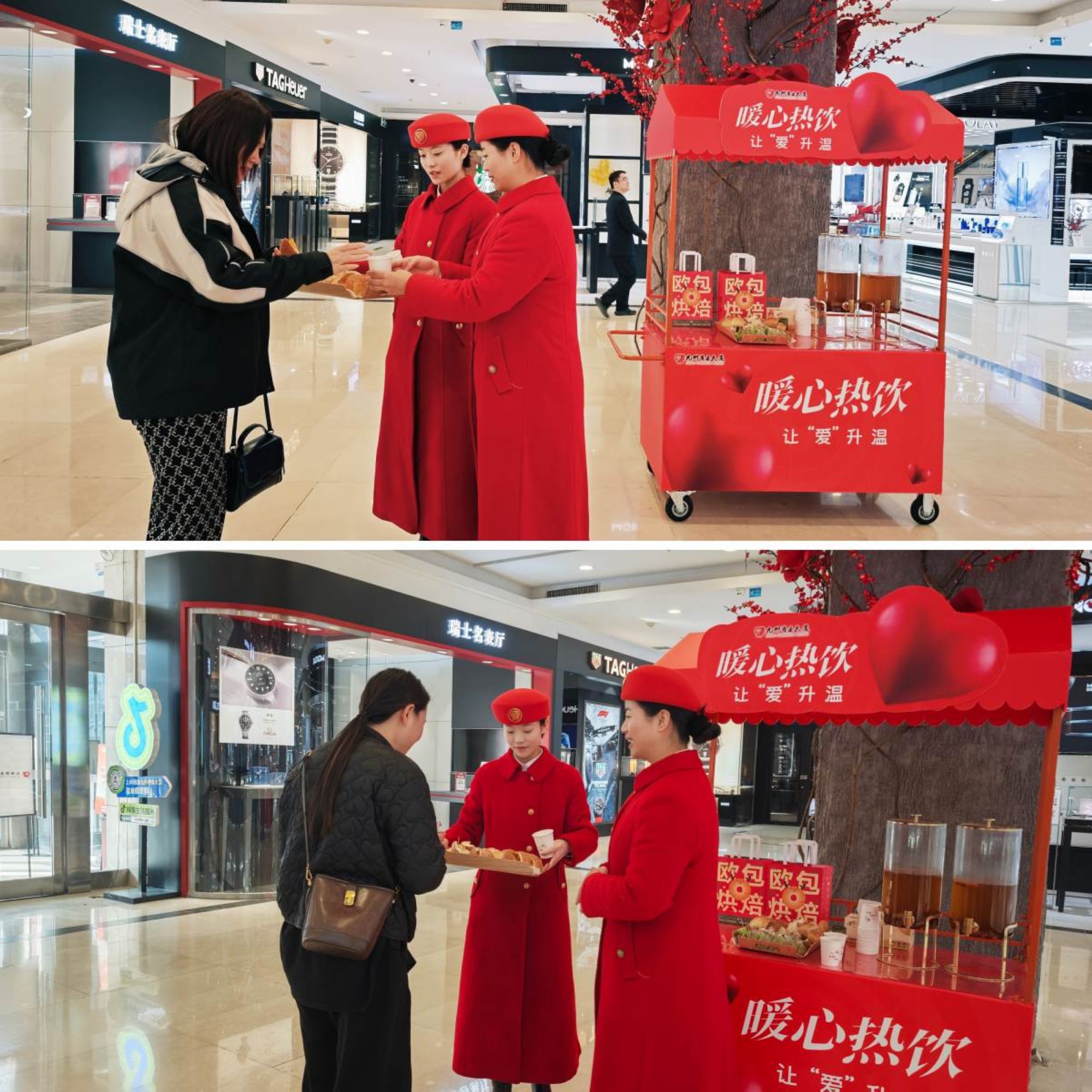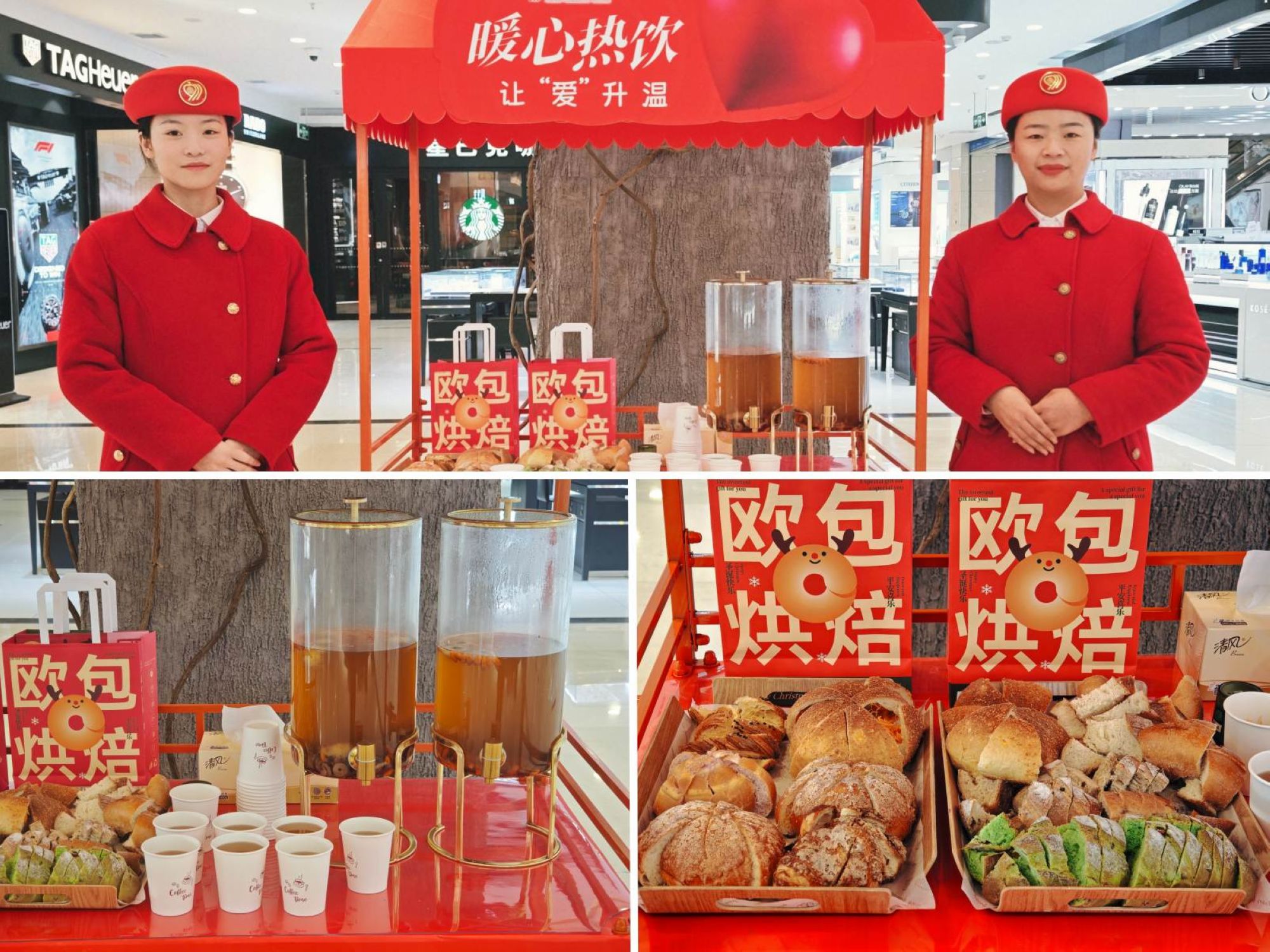 活動(dòng)現(xiàn)場布置了以紅色為主題的暖心熱飲站,備有菊花去火茶、雪梨潤喉茶、生姜暖胃茶等熱飲,搭配歐包烘焙小面包供顧客免費(fèi)品嘗。工作人員面帶微笑,為往來顧客遞上一杯杯溫?zé)岬牟栾嫞岊櫩驮谫徫镏喔惺艿綄?shí)實(shí)在在的關(guān)懷,也讓九州商業(yè)大廈成為冬日里的“溫暖坐標(biāo)”,為顧客驅(qū)走冬日里的嚴(yán)寒冷意。